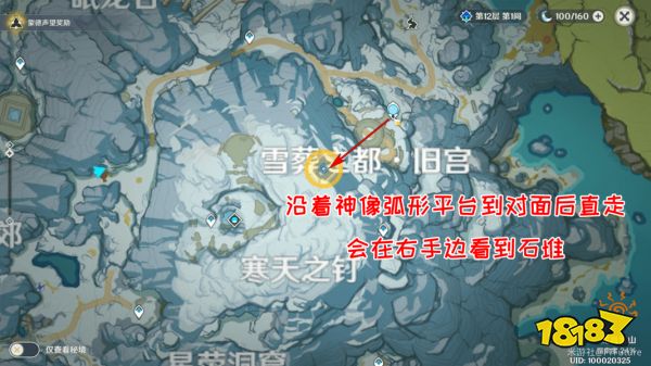 循着小地图的指引,我们来到雪山西面的山坡,前进路线如图所示,可以直接从雪山山顶的传送点飞到(尚未解锁山顶的小伙伴可以从其他位置绕路过来,追踪任务有明显的黄色光柱提示)。