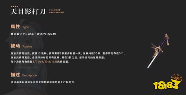 基础攻击比较低,副属性加百分比攻击力,技能是加元素充能,目测可能适合辅助单手剑角色充能,但是实际效果有待商榷