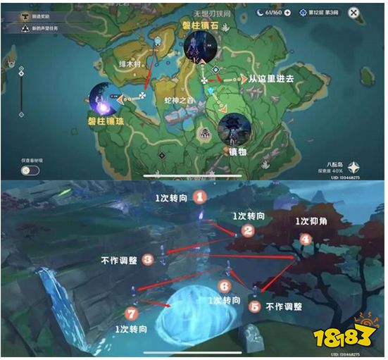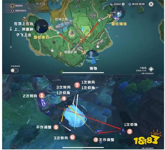 在蛇骨矿洞任务标记点,【镇物】前,打开元素视野,会看到两条路线,右边的是【镶玉】,拿雷种子进入屏障,建议携带温迪、刻晴、钟离、岩主任意角色。左边是【镇石】,这个注意拿雷种子,贴近头顶的石壁飞,在上面。完成这个任务后八酝岛南部雷雨停止,天气放晴。这时我们可以前往「阵代屋敷」秘境前的火把,点燃火把即可开放秘境。