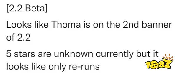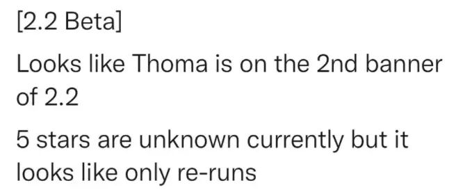 从目前来看,2.2的池子与之前官方曝光托马之后,大家猜测的基本一样,大概意思就是目前托马会在2.2的第二个池子出现,但是目前2.2版本并没有其他的五星(托马应该是4星),所以2.2大概率应该是两个复刻池,不过目前复刻哪两个五星还没有准信。