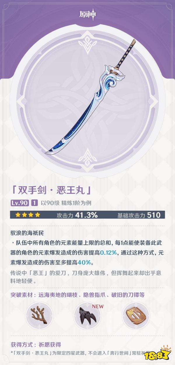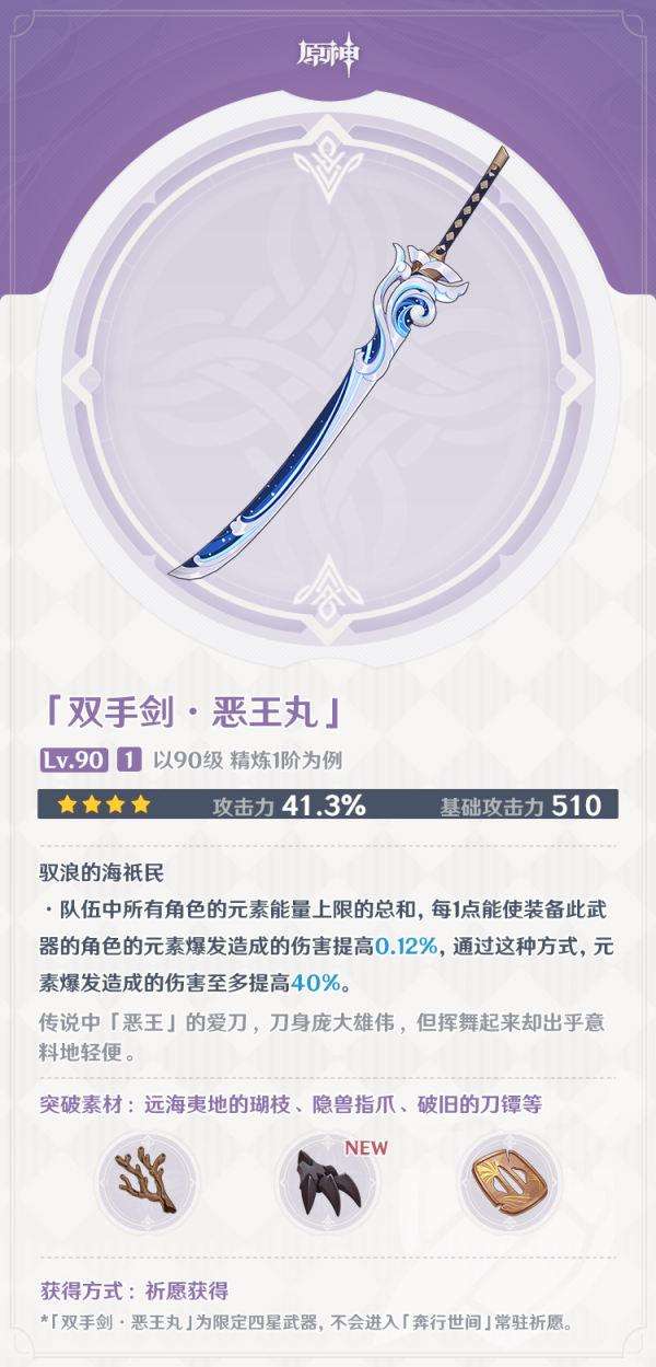 原神2.2版本将推出新的四星双手剑恶王丸,部分玩家可能还不了解这把武器,下面一起来看看原神双手剑恶王丸属性效果介绍吧。