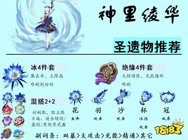 作为主C,神里绫华的武器推荐为雾切、绿剑、天目影打刀,圣遗物推荐为冰4件套,亦可用绝缘4件套。