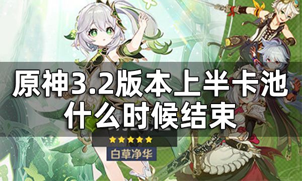 原神3.2版本上半卡池于2022年11月18日17点59分结束,由于3.2版本上半卡池同3.2版本一同于11月2日开启,即3.2版本上半卡池将持续17天,卡池包括五星角色纳西妲和宵宫,四星角色班尼特,雷泽和诺艾尔等。