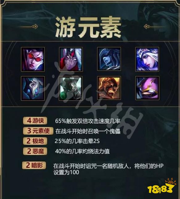 游侠:薇恩、寒冰、维鲁斯、千珏,2/4名游侠英雄即可组成羁绊关系,每3秒有25%/65%的几率攻速翻倍。