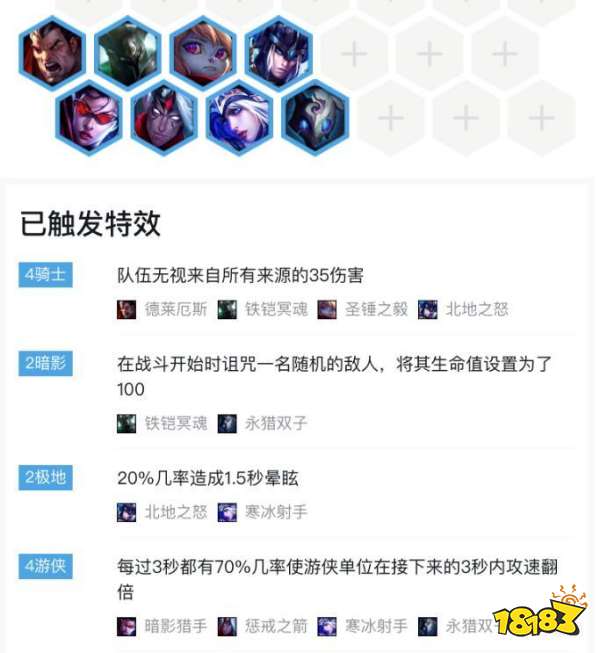 在我们搜不到天使时,4游侠也是非常优秀的后排选择。有寒冰和极地羁绊补充了一些控制,更可以通过4游侠极大的增幅神装薇恩的输出。但是这一阵容毕竟是找不到天使时的备选,所以在搜到天使后转回6骑还是更为明智的选择。