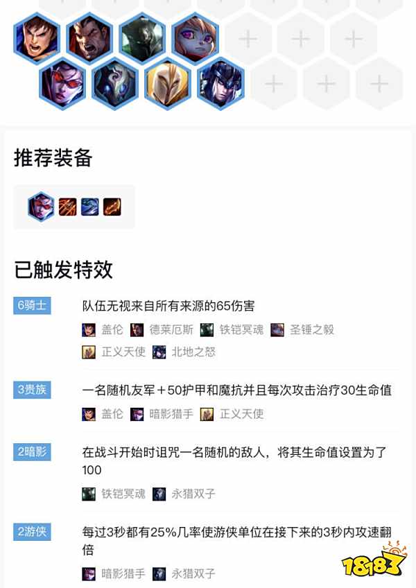 帝国骑士可以说是当前版本的最强阵容之一了,如果在4-x回合,达到6人口时拥有一定的质量,且能够顺利白嫖到2星德莱文,就可以直接转型帝国骑士,从搜天使转变为搜乌鸦。当然如果能拿到骑士之誓甚至可以在8人口凑齐6骑4帝国。