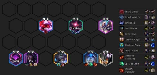 阵容组成:波比;铁男;艾希;卡尔玛;杰斯;烬;悟空;蕾欧娜;