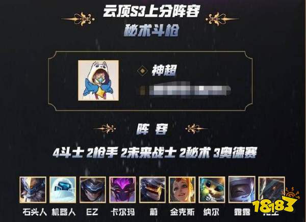 斗枪增强了一波,前排输出更加的恐怖,加上纳尔的加入,如虎添翼。阵容英雄:石头人,机器人,EZ,卡尔玛,蔚,金克斯,纳尔,璐璐,龙王,这个阵容首先把大虫子换成了纳尔,整体控制和输出大大提高,而且后排有金克斯的存在,基本就是很无解的.