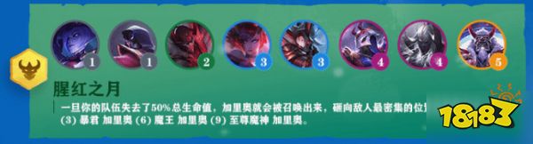 【腥红之月】是第四季中的另一个大型特质,拥有8位英雄,比任何羁绊都要多!有趣的是,这个羁绊不会为【腥红之月】英雄们提供任何威力。反倒是,【腥红之月】英雄们会使用他们的威力来召唤【魔王加里奥】到队伍中!场上的【腥红之月】英雄们越多,则【加里奥】会越强力。