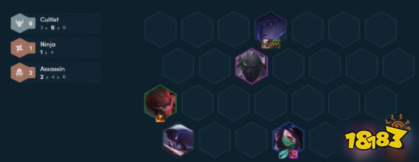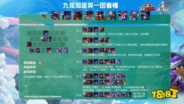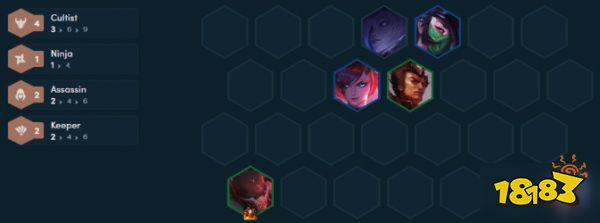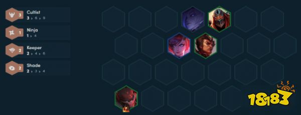 开局2-1上4人口,前期凑猩红和忍者,劫、阿卡丽、凯南有哪个上哪个,猩红凑3个即可,哪怕全1星,加里奥也有1800血,相当于一个半两星单位,配合前期最强红BUFF选手派克,会让对面知道什么叫厉害。