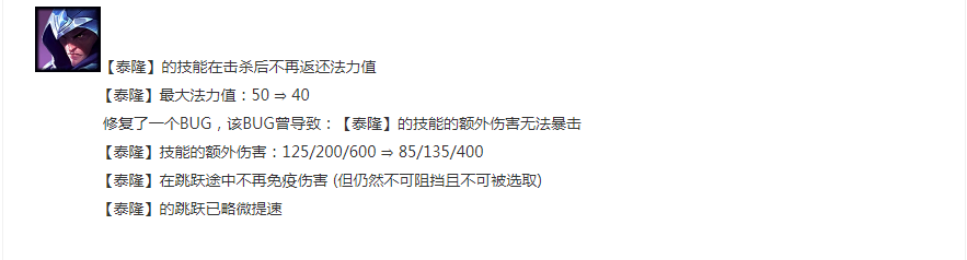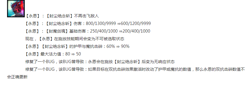 永恩的改动比较独特,技能的击飞效果没有了,伤害也降低,作为平衡,永恩的最大法力值降低了。