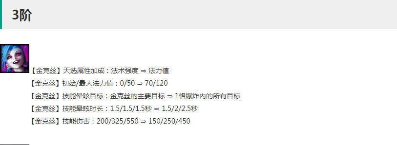 金克丝的技能和属性进行了大量的调整。眩晕时间变长,而且目标变成了范围目标,但代价就是金克丝的最大法力值提高了。