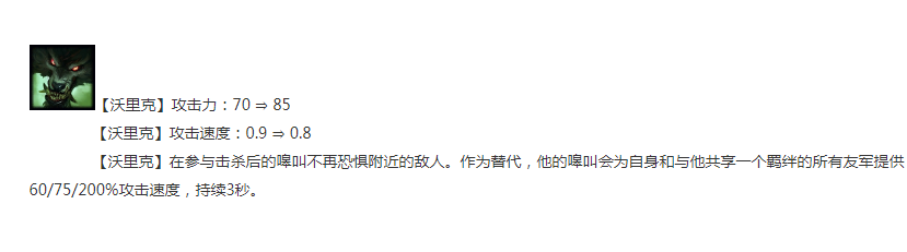 狼人的技能改了,之前是恐惧,现在是只要和他一个羁绊的英雄,都可以共享攻速加成,这是一个新能力。