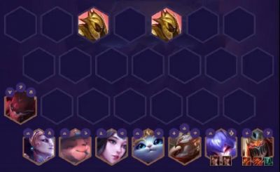 阵容变阵方面,8人口如上阵容图,9人口可把迦娜和阿兹尔下了,换上奥拉夫、莎弥拉和泰达米尔凑到6战神4明昼,超级暴力输出!