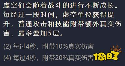 二虚空效果:在对局中虚空们每隔一段时间,虚空们的普通攻击和技能将附带10%额外的真伤效果,最多叠加5层。(如下图所示)