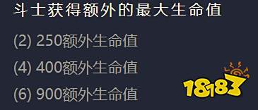 当同时拥有二个斗士、四个斗士、六个斗士的时候羁绊效果分别为:斗士额外获得200、400、900的生命值。(如下图所示)
