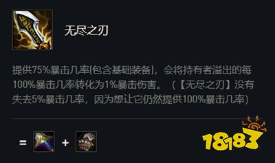 提供75%暴击几率(包含基础装备),会将持有者溢出的每100%暴击几率转化为1%暴击伤害。(【无尽之刃】没有失去5%暴击几率,因为想让它仍然提供100%暴击几率)