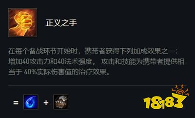 在每个备战环节开始时,携带者获得下列加成效果之一:增加40攻击力和40法术强度。 攻击和技能为携带者提供相当于 40%实际伤害值的治疗效果。