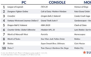 外媒superdata统计了全世界PC端以及主机端和移动端游戏2020年1月份的收入情况。