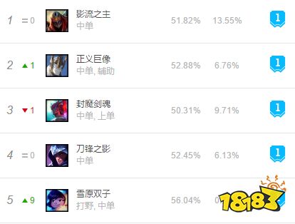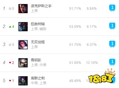 中单第一名没有变化,刺客英雄向来很受玩家们的喜爱,劫以51.82%胜率和13.55%的选择率排名中单第一。尽管拳头在10.18版本对加里奥的Q技能基础伤害进行了削弱,但凭借较强的对线能力以及超快支援并能提供控制技能的大招,加里奥在中路排行还是拥有一席之地,以52.88%上升一个排名,目前位于中单第二宝座。第四名男刀排名无变化:能克制男刀的英雄较少,本身蓝耗较低,游走能力极强,可帮助其他路建立优势。第五名是个意外~0.77%的选择率,56.04%超高胜率~你们继续快乐就好。