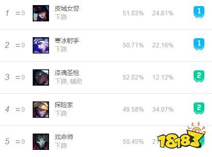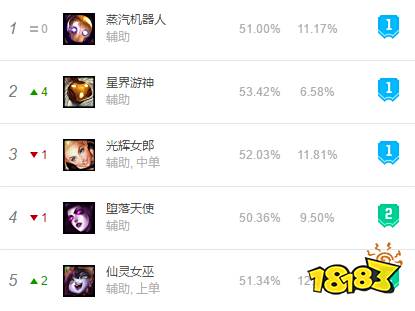 可以通过Q技能改变整个战局的机器人依旧排名第一,无人撼动他的位置。巴德以辅助第二高胜率53.42%上升四个排名、来到辅助第二名。温馨提示:不是双排的话,切勿拿出来和路人AD配合!和女警较好搭档的光辉依旧属于第一梯队辅助。
