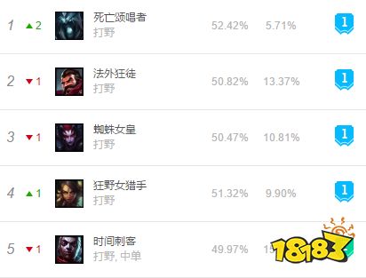 打野排名相较于上个版本变动较大,打野死歌以52.42%的胜率以及5.71%的选择率上升两名登顶。传统打野英雄男枪和蜘蛛排名下降。豹女也上升一名挤掉了艾克第四名的位置。