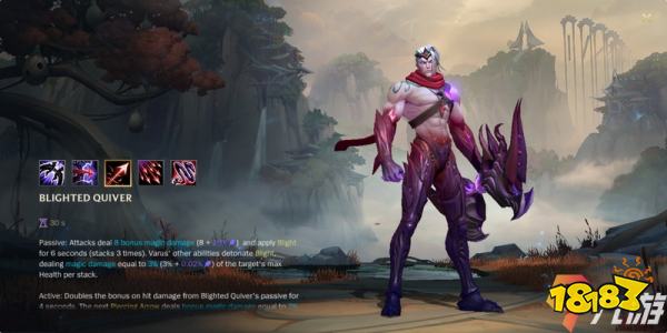 被动:普攻造成8+20%AP的魔法伤害,并施加枯萎效果,持续6秒,最多叠加3层。韦鲁斯的其它技能会引爆该效果,每层造成(3%+0.02%AP)目标最大生命值的伤害。