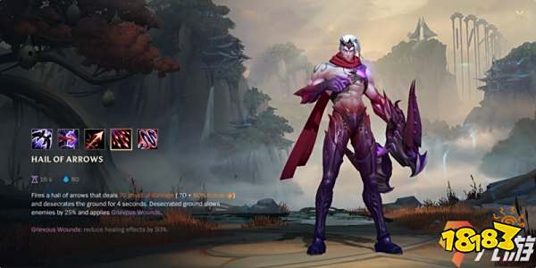 射出一阵箭雨,造成70+60%额外AD的物理伤害,污染这篇区域,持续4秒。处于污染区域的敌人会被减速25%,并且受到治疗效果降低50%。