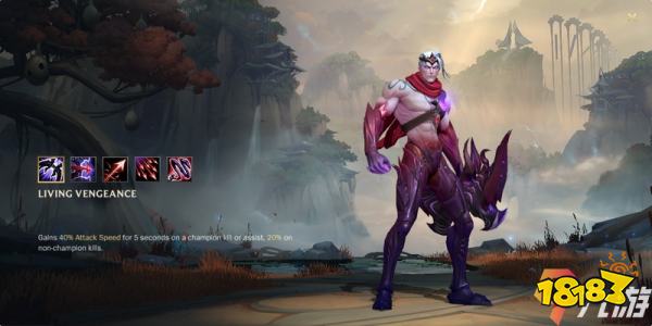 击杀或者参与击杀英雄获得40%攻速提升,持续5秒。非英雄单位的击杀则提升20%攻速。