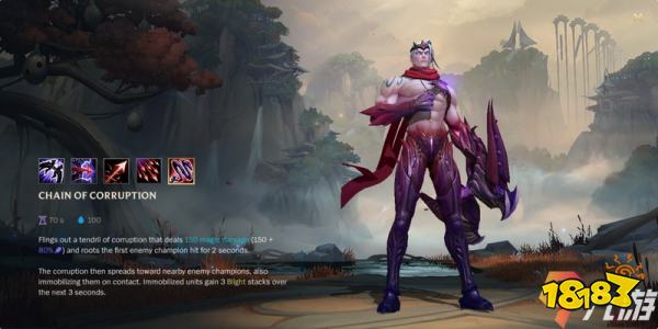 投掷出藤蔓,造成150+80%AP的魔法伤害,禁锢触及的第一个敌方英雄,持续2秒。随后腐败会向周围蔓延,对附近英雄同样造成禁锢效果,被禁锢的单位会在3秒内获得3层枯萎层数。
