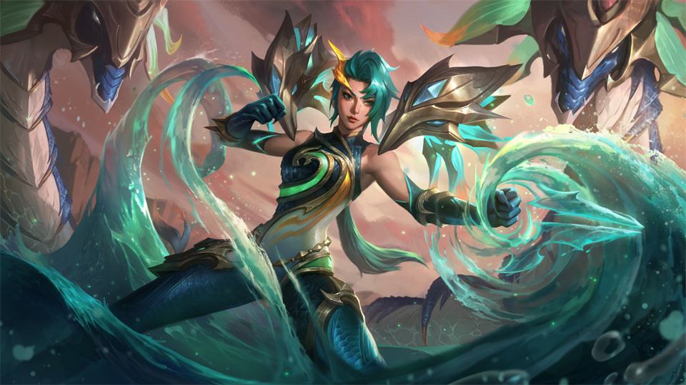 而在设计卡莎的皮肤时,设计师更多的将思路聚焦于如何将玉境灵龙所在的灵湖视觉化并把它转化成一个强有力的元素。它是一种很特殊的水域,为此设计师参考了很多不同的灵湖,才能提取出现在看到的颜色。在她的皮肤设计中,可以看到设计师运用了非常独特的蓝色和绿色,同时以黄色和金色加以强化,将卡莎本身的特点与神龙尊者的要素有机的结合在一起,又不会有违和感。