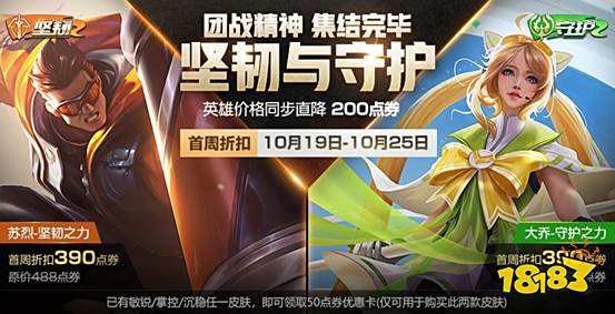 为了迎接终于集结完毕的大乔和苏烈团战皮肤,活动期间内凡是已拥有(沉稳/敏锐/掌控)其中任意1款团战皮肤的玩家,都可以直接领取一张50点券优惠卡,可在首周折扣的基础上再减少50点券哦。