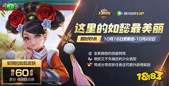 2、 10.16更新后安琪拉-如懿限时秒杀一周,原价488点券,现在仅售60点券,活动结束后安琪拉-如懿将下架