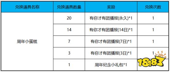 活动期间,收集周年小蛋糕可免费兑换周年纪念荣耀播报——有你才有团;