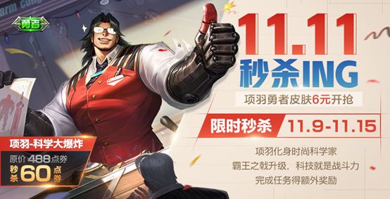 王者荣耀6号进行了正式服的更新!双十一活动全面曝光,项羽新皮肤科学大爆炸限时秒杀,6元钱即可获得。同时11.11狂欢,超炫四件套参与活动送送送,单身贵族头像狂免费拿,一起来看看本次更新的活动内容吧。