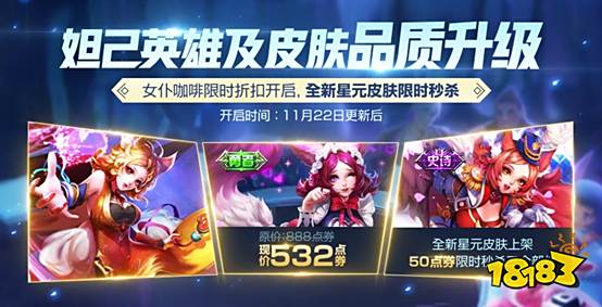 2、 妲己英雄/皮肤品质升级,新星元皮肤上线,超靓星元【三件】秒杀,打包50点券。