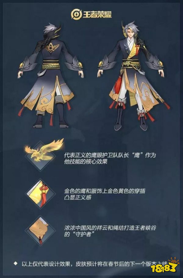狄某作为鹰眼护卫队队长,我们提取了鹰这一核心的标识作为整个皮肤的基础元素,这一形象会在技能展示、出场特效中均有所表现,当然狄大人的衣服上也会有相应的标志。