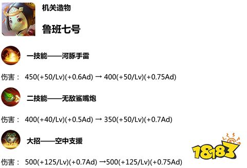 鲁班七号在此次的技能调整中,对1、2技能的伤害都进行下调,但提高了他大招的伤害,从整体上本次调整对他有所削弱。