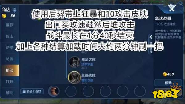 很多人都没有发现,其实这次的荣耀战令的任务是可以通过人机来完成的,我们首先是可以选择1V1的人机模式的,使用后羿这个英雄,然后带上狂暴和一个皮肤,出门直接买攻速鞋主要堆攻速和攻击力,