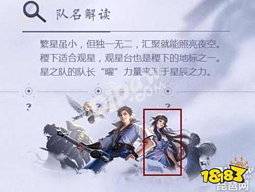 2.本周曜的故事站开放,同时公布了队伍里另外四个成员,孙膑是已上线的英雄只是模型优化不需要重新出,西施和鲁班大师的造型都直接放出来了,反而是另外一下蒙犽只有剪影图,没有全图的话这个英雄很可能是下个版本最后一位英雄。