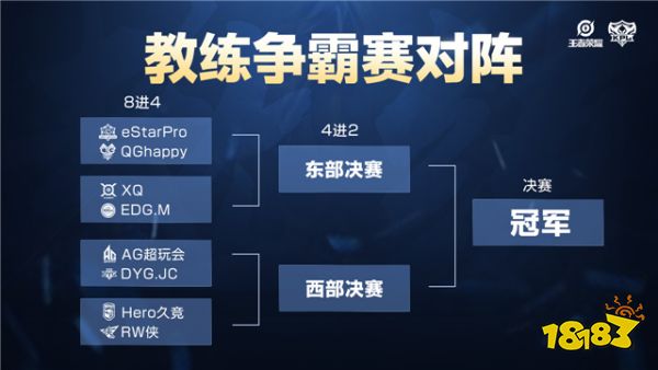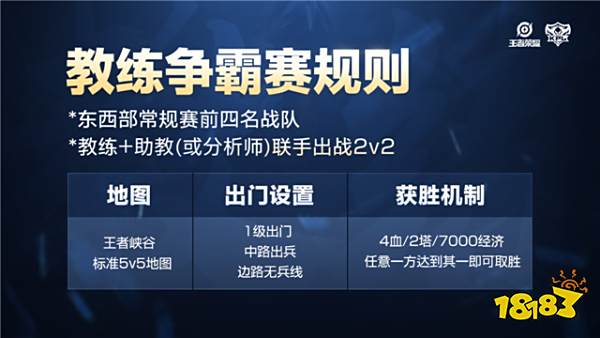 KPL最强教练争霸赛将邀请东西部常规赛前四队伍的一名主教练和一名助教(数据分析师)共同参赛,进行一场2V2的对决,对决为BO3单败淘汰制。
