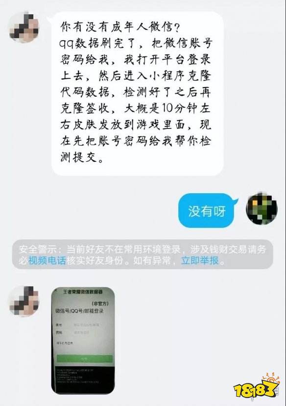在游戏公屏里类似“收徒弟,乖的送皮肤”、“大神带队,3q2加就送皮肤”、“一起上分,赢就送皮肤”的消息,这疯狂送皮肤的阵势,虽然大部分玩家能隐约感觉不对劲,但仍然不清楚骗子们的目的。