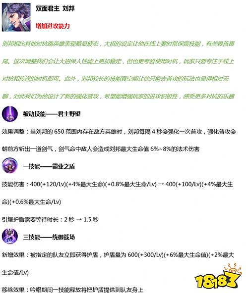 这次改动总体上是对于刘邦的加强,一定程度上解决了刘邦团战有时候会出现给盾不及时的情况;同时一技能和被动的改动也让其对脆皮也能够构成威胁。