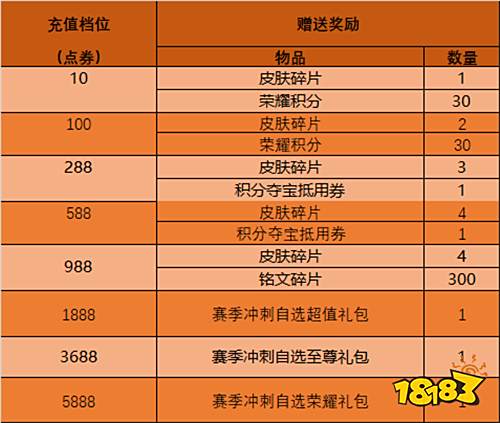 赛季冲刺自选荣耀礼包*1+赛季冲刺自选至尊礼包*1+赛季冲刺自选超值礼包*1+积分夺宝券*2+皮肤碎片*14+荣耀积分*60+铭文碎片*300