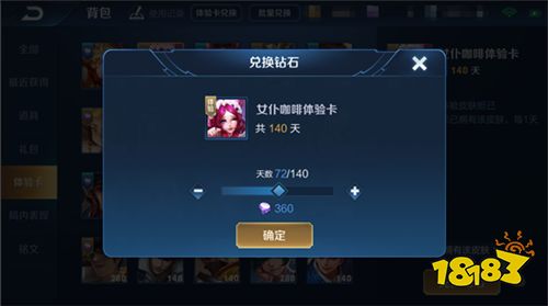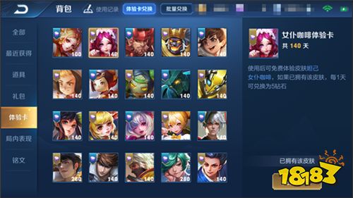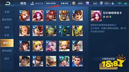 2、对于已拥有英雄/皮肤/永久局内表现的体验卡,我们优化了兑换为钻石的流程,对于单个体验卡兑换钻石,可以快速选择天数进行兑换,同时我们也增加了【批量兑换】功能,各位召唤师可以前往【背包】-【体验卡】/【局内表现】进入【批量兑换】,根据需要选择【全选】或者【每类保留一天】,亦可手动再次选择左侧亮起的体验卡头像,进行取消选中。