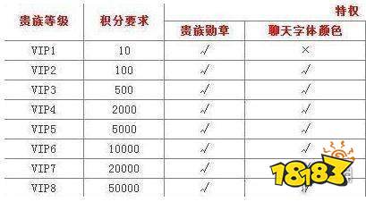 贵族1只需要消耗10积分,贵族2是100分,贵族3是500分,贵族4需要2000,贵族5需要5000,贵族6要10000,贵族7要20000,而位于贵族最顶端的贵族8需要50000分。也就说贵族8需要消费5000元!