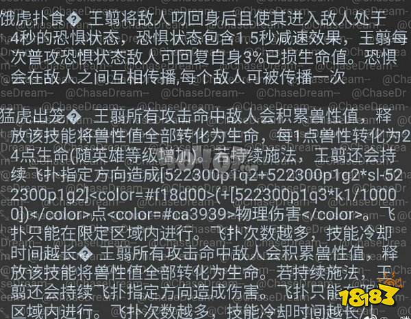 王翦攻击如果命中敌人的话,能够增加其兽行值,释放该技能之后能够将兽行值转化成为生命值,每一点兽行值能够转化为24点生命之,如果持续攻击的话,王翦会持续飞扑技能对敌人造成物理伤害,但是只限于限定的范围内。