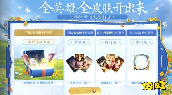 届时只要开出三张荣耀卡都是“锦鲤卡”的小伙伴可以获得全英雄皮肤奖励,需要注意的是全英雄皮肤仅限10月30号前上架的直售英雄皮肤,也就是说不含武则天、不知火舞这类非金币英雄,以及五虎上将等限定皮肤,即便如此全英雄皮肤的奖励还是很给力的。若是得到两张锦鲤卡的小伙伴可以高级皮肤三选一(李信——一念神魔、瑶——遇见神鹿和后羿——黄金射手座),而得到1张锦鲤卡的玩家则是三位英雄的288皮肤任选一款。当然所有参与的玩家不管有没有翻出锦鲤卡,都能领取6周年专属相框奖励。