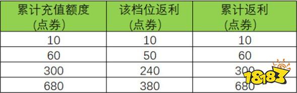 活动规则:6周年特别福利,充值点券到指定额度档位,返相等额度点券,最多返680点券。