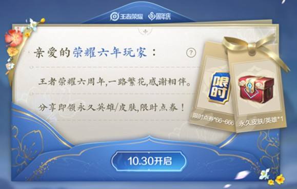 活动规则:10月30日当天登录并分享活动,即可领取王者六周年惊喜宝箱*1(打开可选择任意颜色(红/紫/褐/蓝/绿/橙)周年惊喜宝箱之一:均有几率开出永久英雄、皮肤、皮肤碎片*10)。